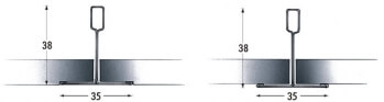 Il sistema 8T35 inc a vista è costituito dal profilo portante da mm 3660 e da intermedi da mm 1220 e mm 610 aventi un aggancio in semplice appoggio. La dimensione di tutto il sistema è di mm 35×38.